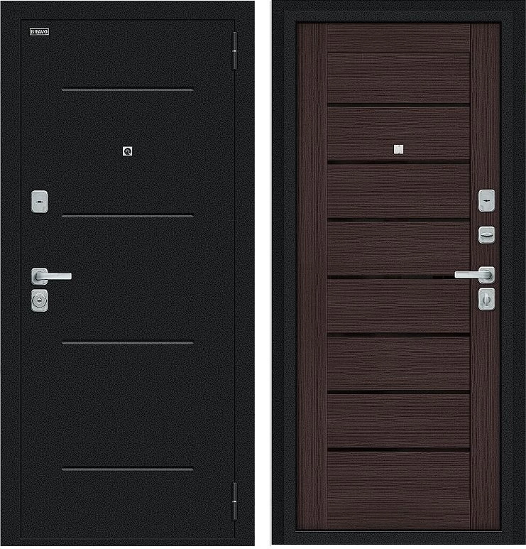 Надежная входная Дверь Браво Техно/BChrome Букле черное/Wenge Melinga премиум класса по цене 34 699 руб. Большая толщина стали защитит от проникновения в ваш дом, квартиру или коттедж. Используется очень качественная фурнитура: замки, цилиндры, ручки, защелки. Покрытие и отделка двери изготовлено под внимательным контролем производителя. Дверь имеет долгий срок службы и гарантию.